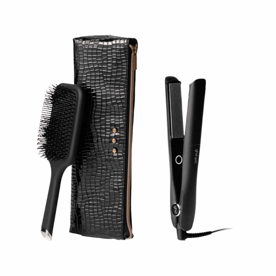 Le ghd gold noir + offert sa pochette de transport noir vernis + une brosse carré de coiffage + un thermoprotecteur ghd format 120ml