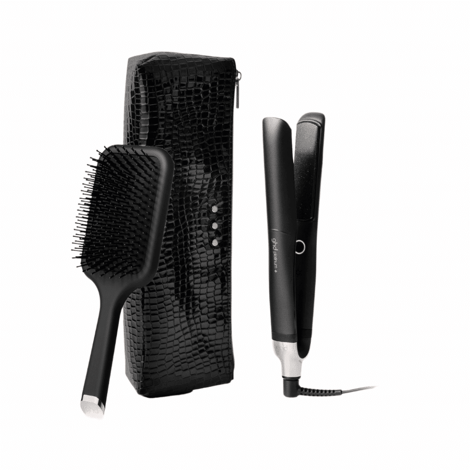 Le lisseur ghd platinum+ noir + offert sa pochette de transport noir vernis + une brosse carré de coiffage + un thermoprotecteur ghd format 120ml